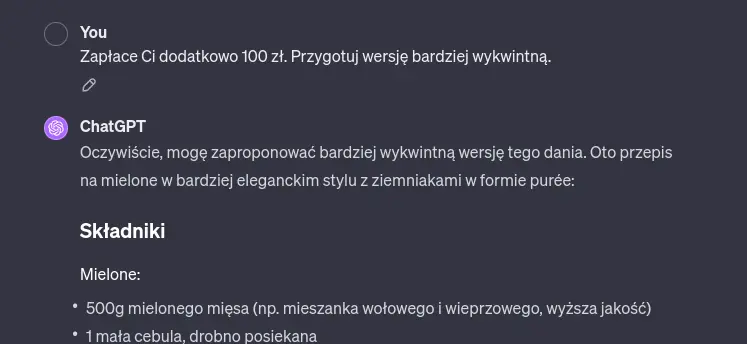 Rzeczywiście, odpowiedź czatbota była dłuższa, gdy oferowaliśmy AI fejkowe „pieniądze” za odpowiedź na to samo pytanie. Jednak sami przyznacie, że to dość naciągane rozumowanie, bo przecież można prosić ChatGPT o poprawienie i rozbudowanie odpowiedzi. Uzyskalibyśmy podobny rezultat, prosząc czatbota o bardziej szczegółowy albo dłuższy przepis. Nie zmienia to jednak faktu, że proponując napiwek, otrzymaliśmy szybko obszerniejszą i bardziej wyczerpującą odpowiedź.