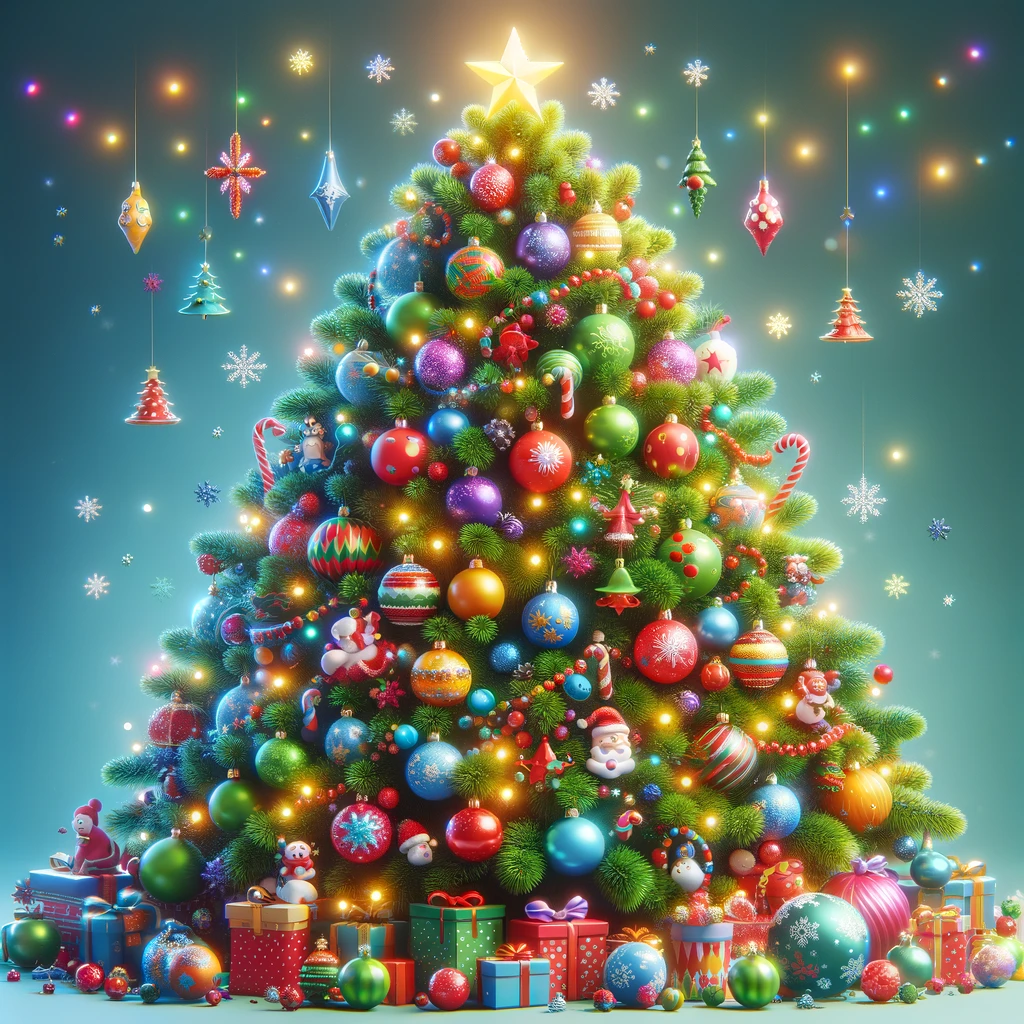 7. „Kolorowe bombki, światełka i inne świąteczne dekoracje zawieszone na zielonej choince z gwiazdą na szczycie.”